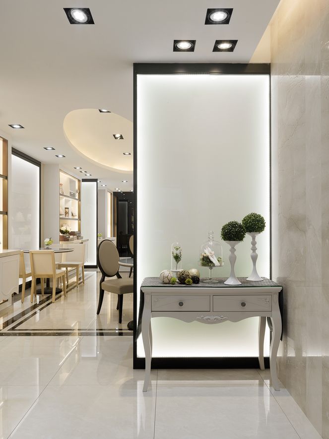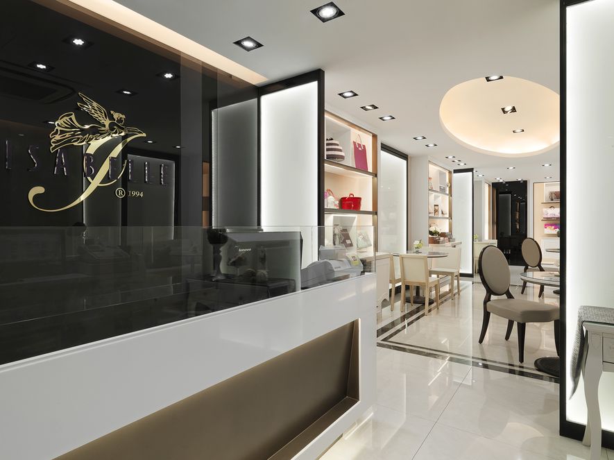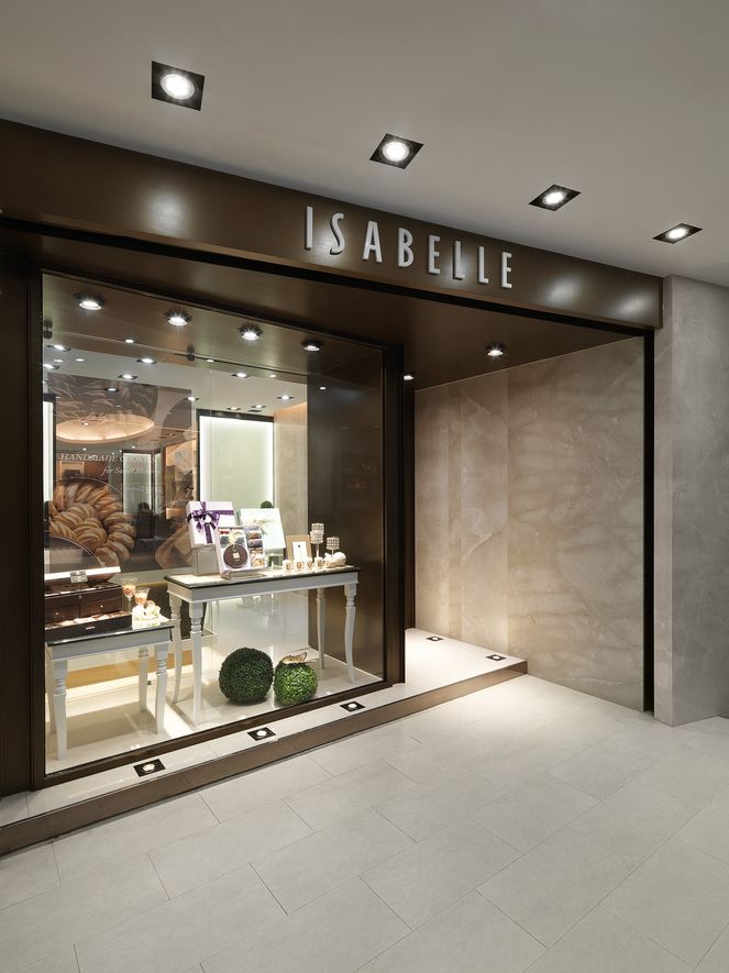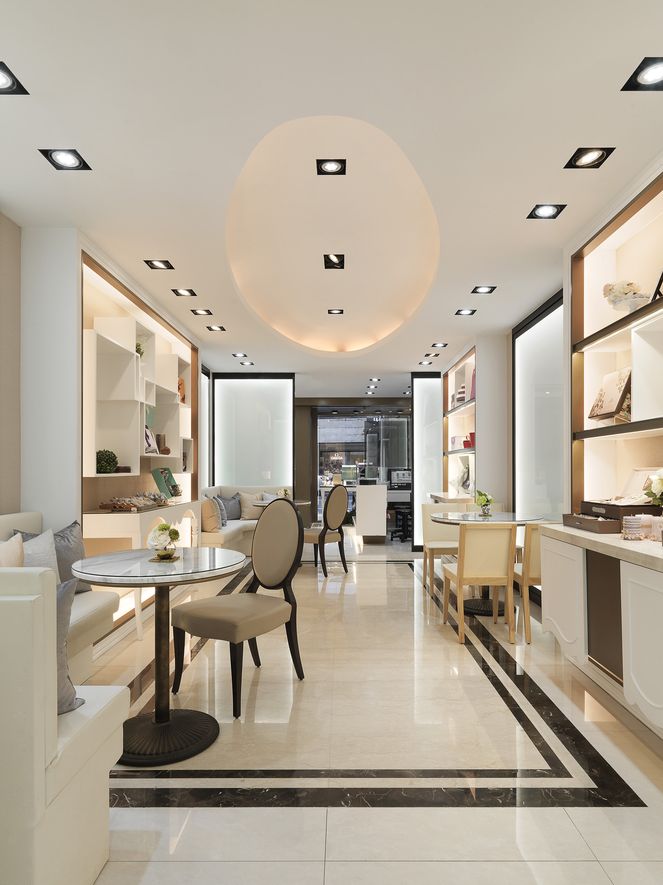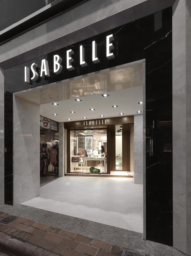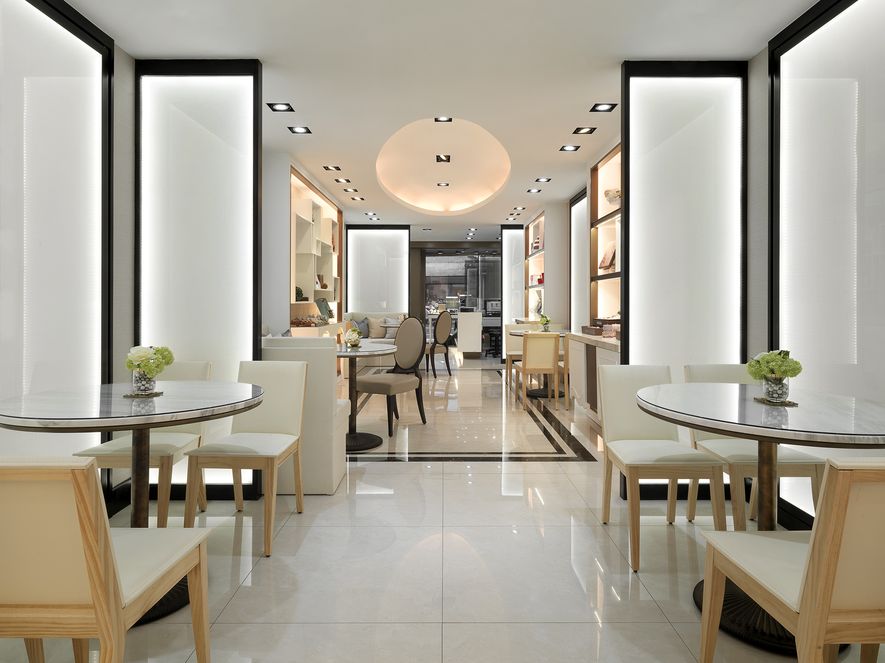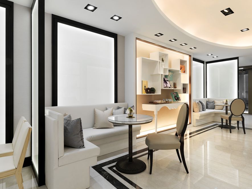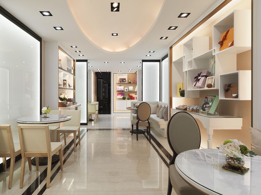 本設計切入構想為同時呈現歐洲的現代時尚及貴族歷史感,一方面襯托出品牌的高級精緻定位,另一方面則希望消費者可以融入在「優雅下午茶」的空間美學中。此美學概念從街道立面的米黑雙色大理石挑高方拱門,連續到騎樓入口櫥窗的古銅色金屬,再延伸進室內的粉白色新古典線條櫃體及傢俱。另外選用布紋質感的玻璃隔屏做為室內分區的元素,為整體空間加入時尚視覺符號,呈現出精品化的專業烘焙禮盒專賣店空間形象。