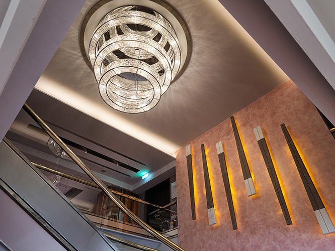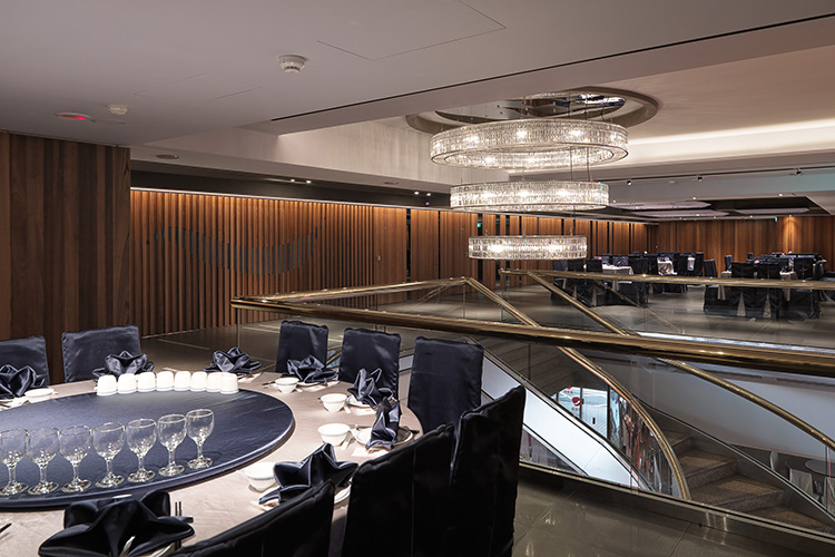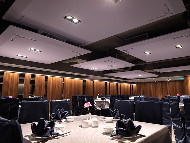 設計理念/中華傳統習俗裏,婚宴喜慶等階段性慶祝活動一向少不了,逢年過節前往餐廳邀請眾親友相聚共舉更是例行公事,在傳統中式用餐氛圍的包圍下,熱炒、糕點、啤酒更是舉家歡騰的必備元素。150 坪的空間內,以豪華氣派的奢華水晶風格做出定調,首當其衝的迴旋式的樓梯設計、隱藏燈飾,搭配著精緻貴氣的璀璨水晶燈,引導著循序漸進的空間轉變,當顧客來到二樓,便已自然地將情緒融入空間的風景,卻又不自覺地受眼前氣派堂皇的宴會空間感到癡迷。