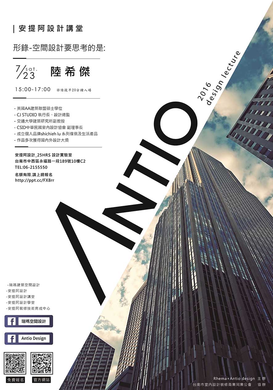 陸希傑將於105年7月23日至台南安提阿設計講堂分享「形錄-空間設計要思考的是:」,與民眾一起探索設計與建築的無限可能,完成呈現他對於建築設計的思考與想法,機會難得,期待民眾一同參與,與安提阿設計及瑞嗎設計共同推動的城市美學運動。