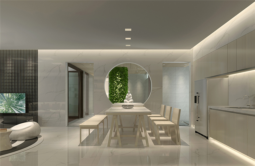 石磚如水墨,木面如宣紙,門洞能借景,餐桌可以根據需要靈活拉長延伸到中庭,可餐用亦可他用,4A造型的桌腿是對傳統工藝的留戀和敬畏。見光不見燈的照明設計營造舒適的氛圍。