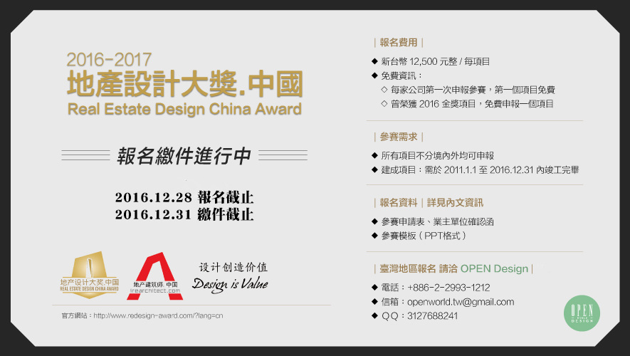 1.地產設計大賽 中國官網「設計推薦」欄目合作:新台幣6,000元整(1年)