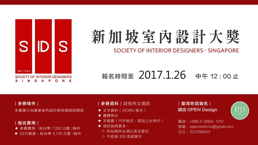 親愛的設計師朋友,新加坡室內設計大賽為SIDS(新加坡室內設計協會)首屆面向全世界的室內設計大獎,該協會專業且歷史悠久,現已成為新加坡最強大的室內設計團體。新加坡於去年獲得聯合國教科文組織設計之都的稱號,SIDS決定在這時刻創建一個面向世界的國際室內設計大獎,為室內、空間設計師和建築師建立一個國際性的交流管道,將新加坡室內設計行業的創意性與專業性推廣到全世界。