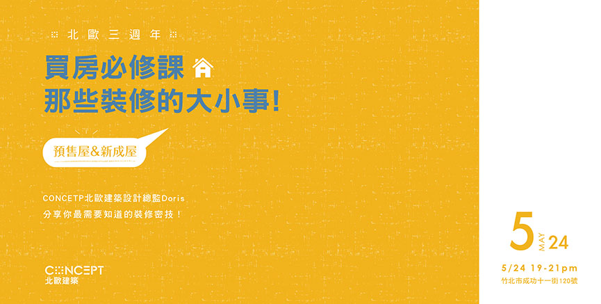 《買房必修課,那些裝潢的大小事》實用講座,將由設計總監留郁琪 Doris幫您完整剖析預售屋裝修上的眉眉角角,以及新成屋的裝修設計重點!