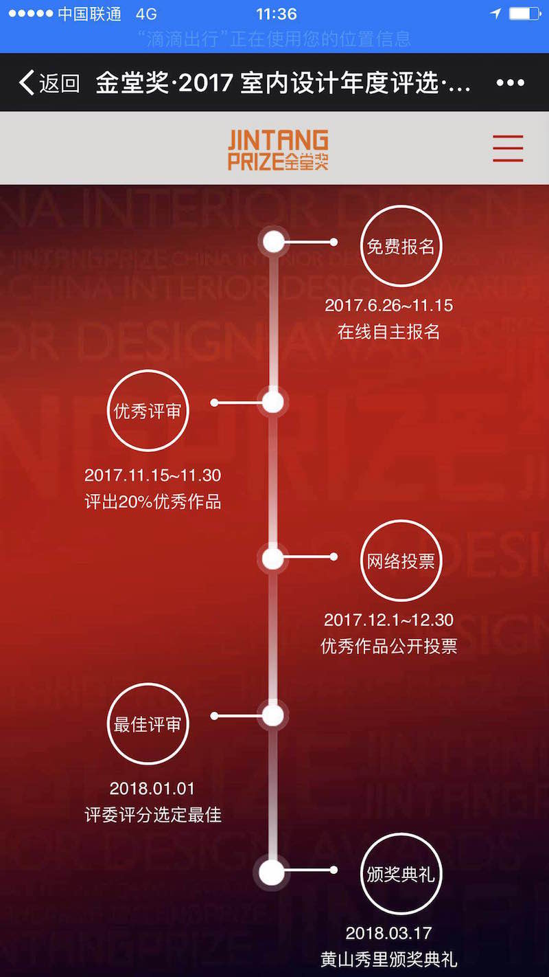 1、2016年1月1日至2017年11月15日在中國境內(包含台灣地區)完工的室內設計項目(同一作品不能重複參加不同年度的金堂獎評選)