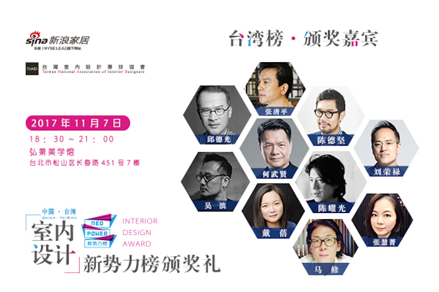 為探尋臺灣設計界的年輕設計力量,挖掘更多華人設計界中流砥柱!今年,新浪家居與TnAID臺灣室內設計專技協會,首度聯合推出「第二屆中國室內設計新勢力(臺灣榜)」,在11月7日晚登陸「2017臺灣室內設計週」並舉行了盛大的頒獎典禮,在頒獎典禮上,正式揭曉了上榜的十位臺灣設計師!