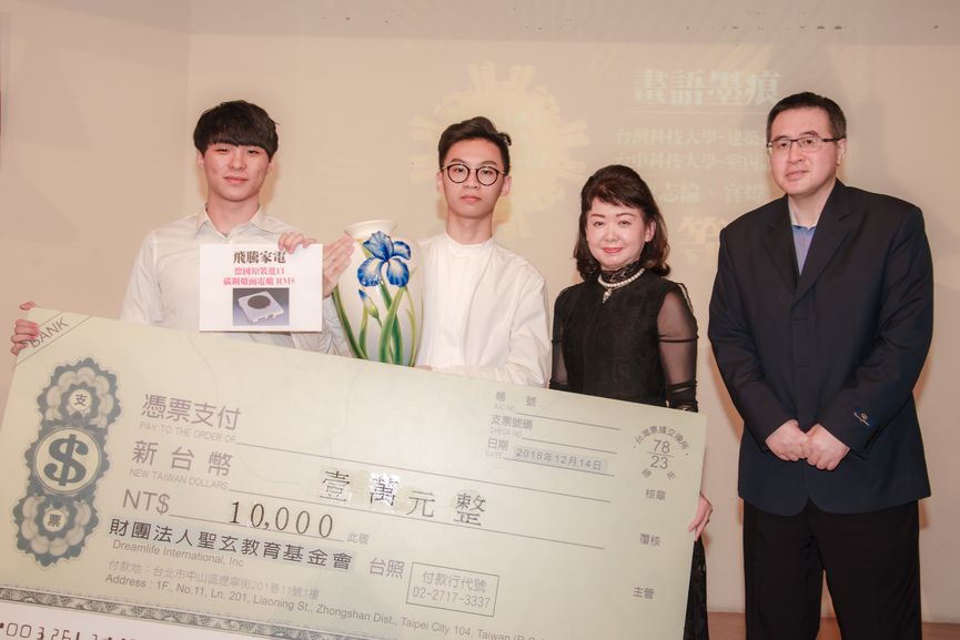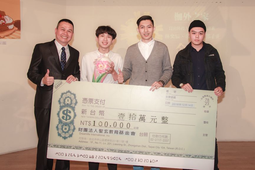 圖:優等獎【畫語墨痕】台中科技大學室內設計系—官煒、台灣科技大學建築系—陳志綸與夢想誌社長陳懿茱以及見證律師合影。