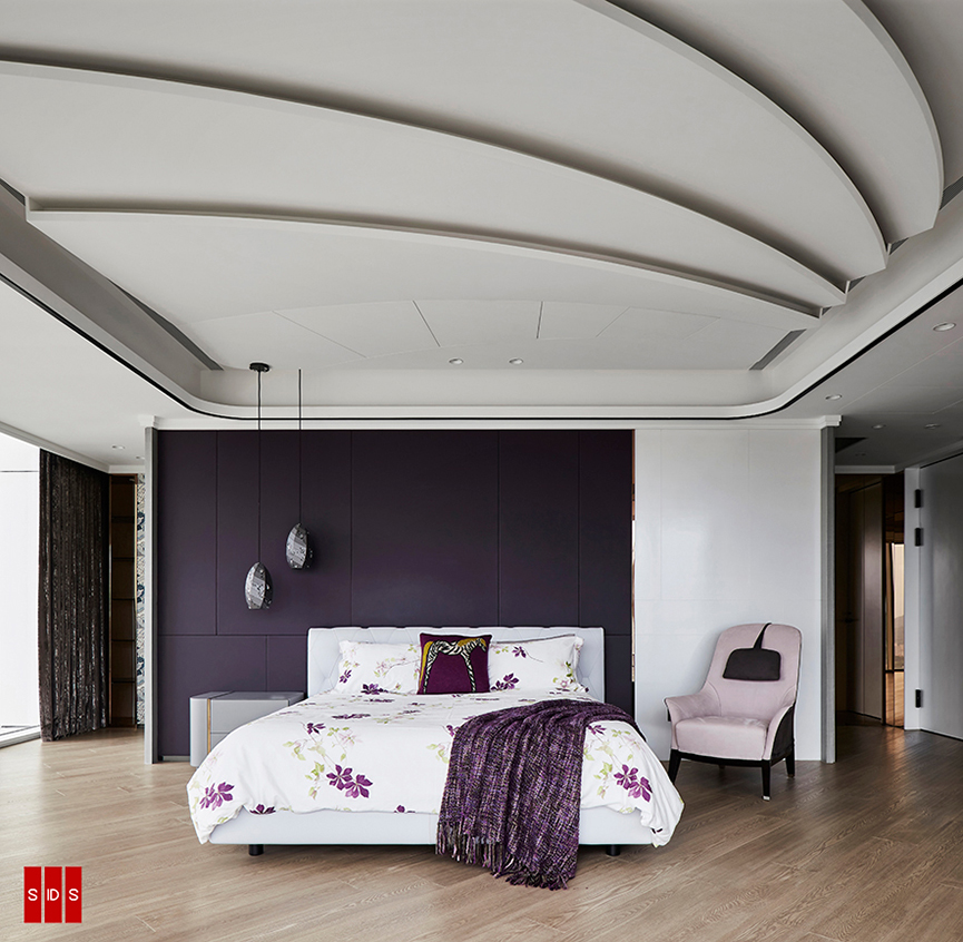 ▲女主臥選配深紫色立面及軟裝,呈現業主兼具柔美與堅毅的女性氣質,亦可烘托床頭夜燈的鑽石光澤,一旁白色牆面則鋪陳反光效果佳的珠光漆,點綴高雅典美的氛圍。