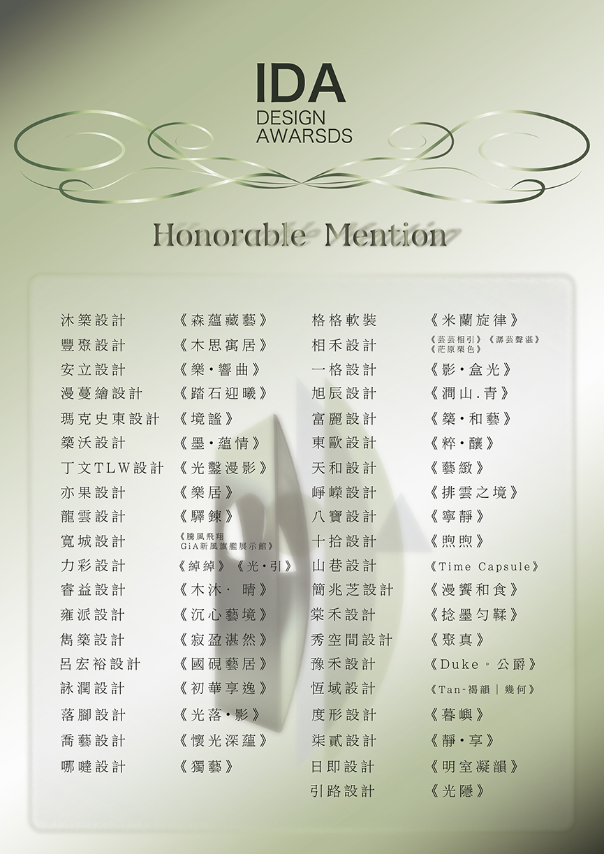 美國IDA 國際設計大獎(International Design Awards),旨在表彰「設立新標準」與「突破室內設計界限」、「改變人們生活和工作空間」的優秀設計師及團隊。以創新性、實用性和發展性等多種面向為評選標準,發掘建築、室內設計、產品設計、平面設計和時尚方面的新興人才,每年吸引來自數十個國家的頂尖設計者,競相角逐此項權威大獎!