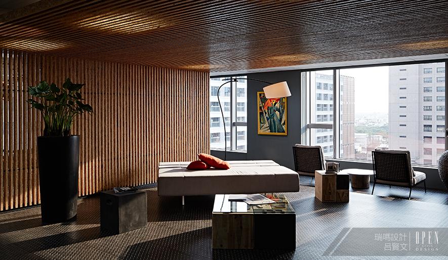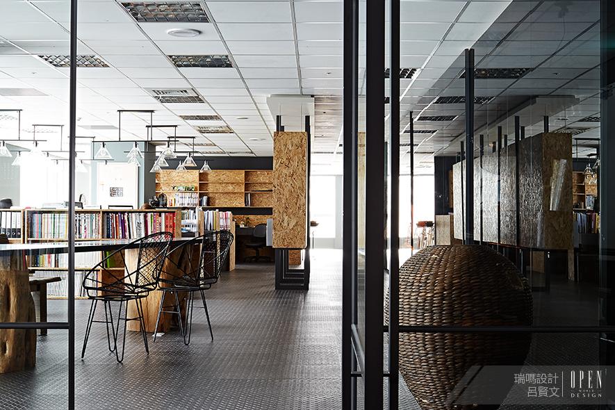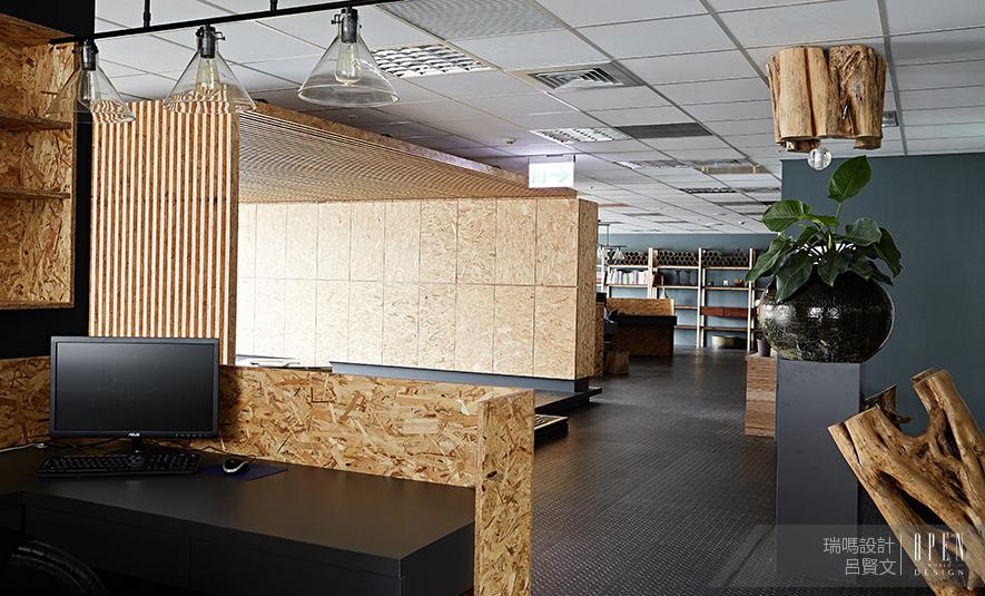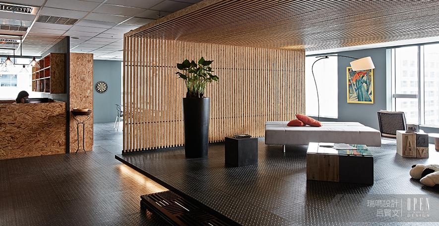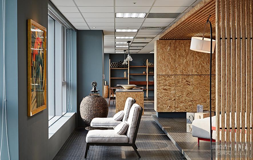 一目了然的開放式設計,會議室、辦公區、用餐區等空間均無明顯分隔,打通的長方形辦公樓層搭配大量落地玻璃幕牆與窗門,營造出極富通透感的無阻隔交流空間,如同藝文人的軒昂氣勢,而木質與鐵件的相互作用,恰似君子之傲骨與柔軟,在木心與綠色植栽的相互幫襯下,除了增添一絲中國風情外,更將現代工業的粗曠融於自然璞真,恰恰表現了此案之設計理念「融剛強於原然」。