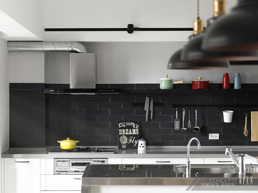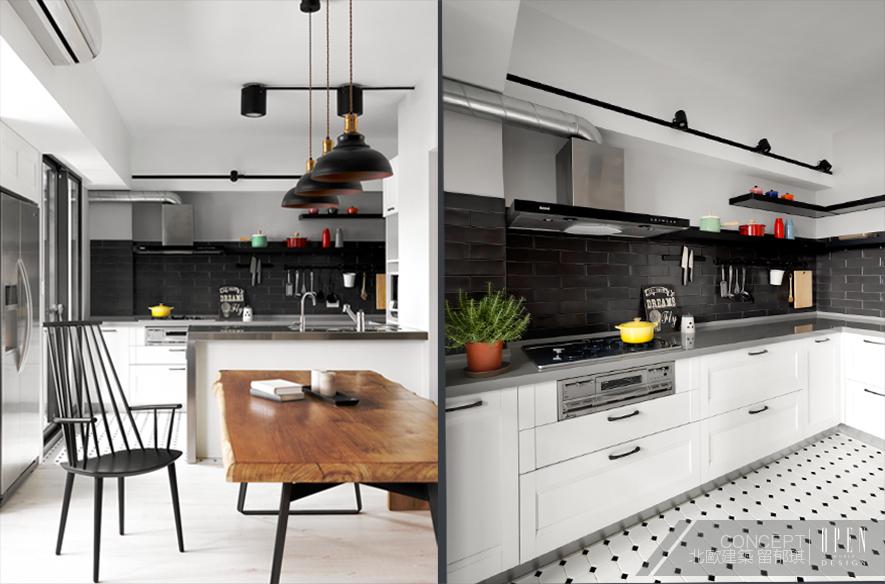 Less is more,一道美味的餐食即能成為最佳精神佳餚。在廚房設計上,設計師以工業風格為設計元素,利用黑白兩色作為空間鋪陳帶出場域的簡約質感,以簡單的色調彰顯烹調才是最重要的事。開放式的公共區域設計,讓餐桌除了用餐以外也能在此閱讀及辦公,為餐廚空間挹注了無限可能也讓屋主在場地運用上擁有更多的自由。