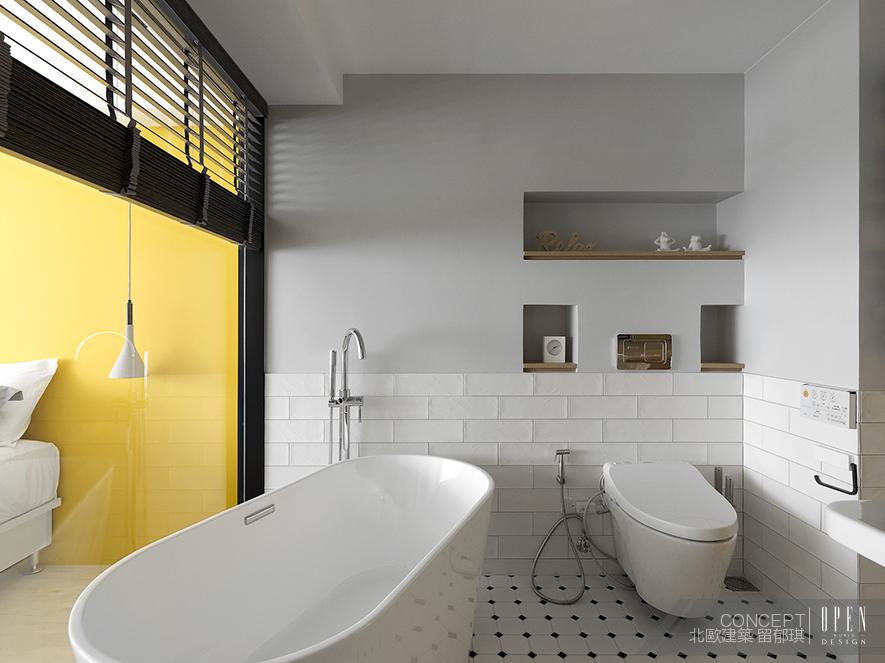 (圖)全案以簡約北歐風格貫穿全室,浴室捨棄實牆以透明玻璃作為隔間,消弭了實牆造成的壓迫感又使浴室採光明亮簡潔,改善浴室原有陰暗封閉的氣氛。