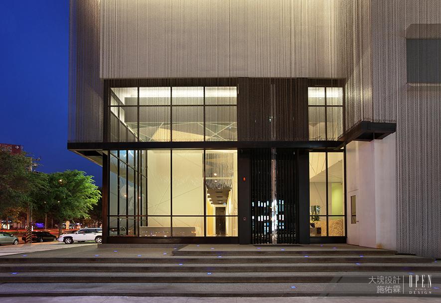 翻轉一般接待中心其封閉呆板的制式印象,在外觀白色方盒子立面,拉起上萬條金屬鐵鏈,宛如細密織紗,包覆著硬朗物件,柔軟而神祕的薄膜,如霧中風景,引人上前狹近、趨探。千絲萬縷,大廳光纖的垂吊,在幾何分割的天地軸線上,絲絲如雨下,在屏息的 靜置空間,傾注了、澆灌了、闊散的不安定的水分子、光分子、躍動的星星,ㄧ傾臨降在肅靜的氛圍中。