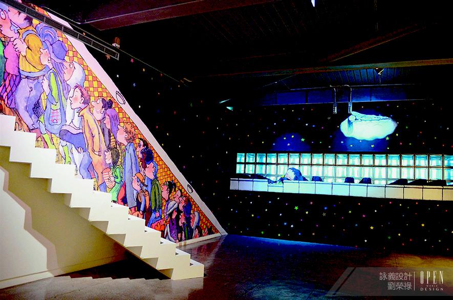 幾米作品本身即具超現實意味,空間設計則將此二度概念拉衍為三度空間,樹立起錯綜的迷宮,使虛幻角色變為可捕捉的形影,利用斜面穿透一幕幕與作品概念結合、交織陳述,空間與繪本的語言沒有隔閡,共同演繹錯置的夢幻時空,將觀者帶往迷離的境域。