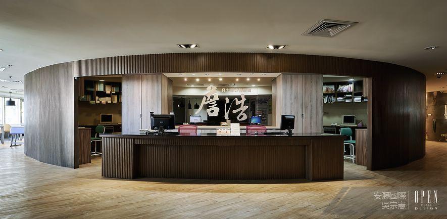 配合圓形的基地建築物,室內裝潢設計以圓弧式的溫柔線條環繞,並利用樓層採光良好的優勢,打造出清新明亮的閱讀空間。圓柱形的接待大廳,以深色的木質紋理搭配大理石牆壁,呈現親近感。