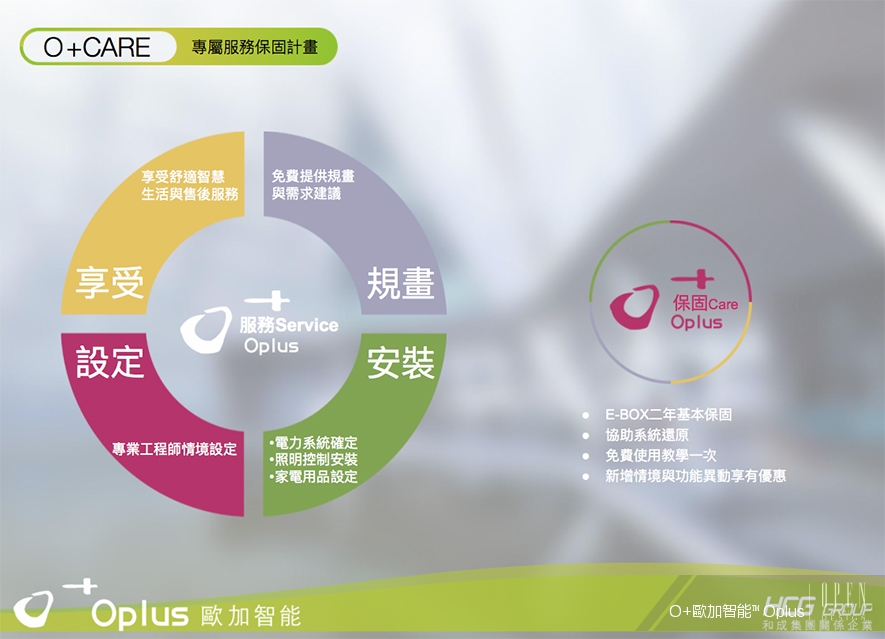 O+ 歐加智能™Oplus 相當重視產品的售後的服務,當購買產品後,除了享有兩年基本保固之外,更提供專業的技術人員安裝設備及工程師協助設定情境規劃等到府服務,提供客戶更多完善的加值服務。