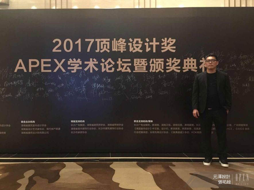 元澤設計 張祐銓 設計總監 將自己的影響力慢慢擴散,憑藉著自己對設計與建築的超高敏銳度,創造出一件又一件讓人驚嘆的作品,更利用自己「水的精神」柔軟、可塑性高的特質,在內地席捲出一波建築與設計的旋風。此次2017頂峰設計獎APEX學術論壇 的精彩表現,讓湖南的設計師們都對他有全新的認識與了解,透過一次又一次的演說與交流,繼續拓展自己的事業版圖並增強建築和設計實力,使作品和價值理念能夠越傳越遠。