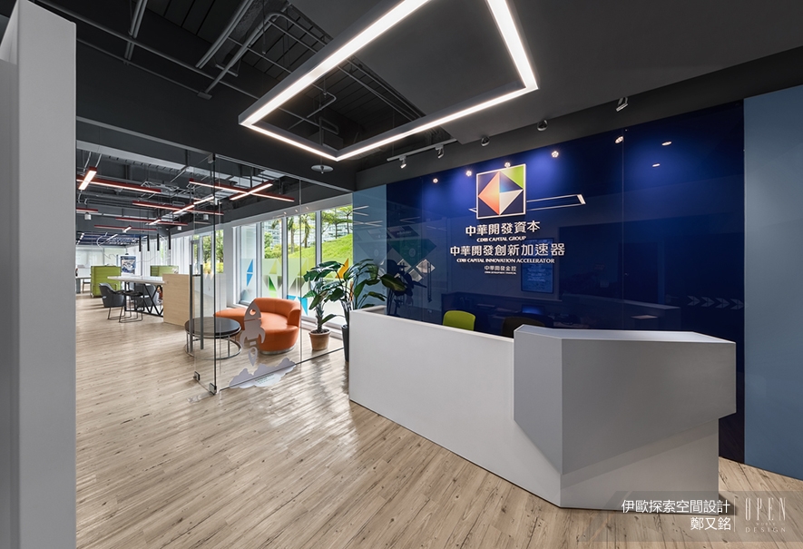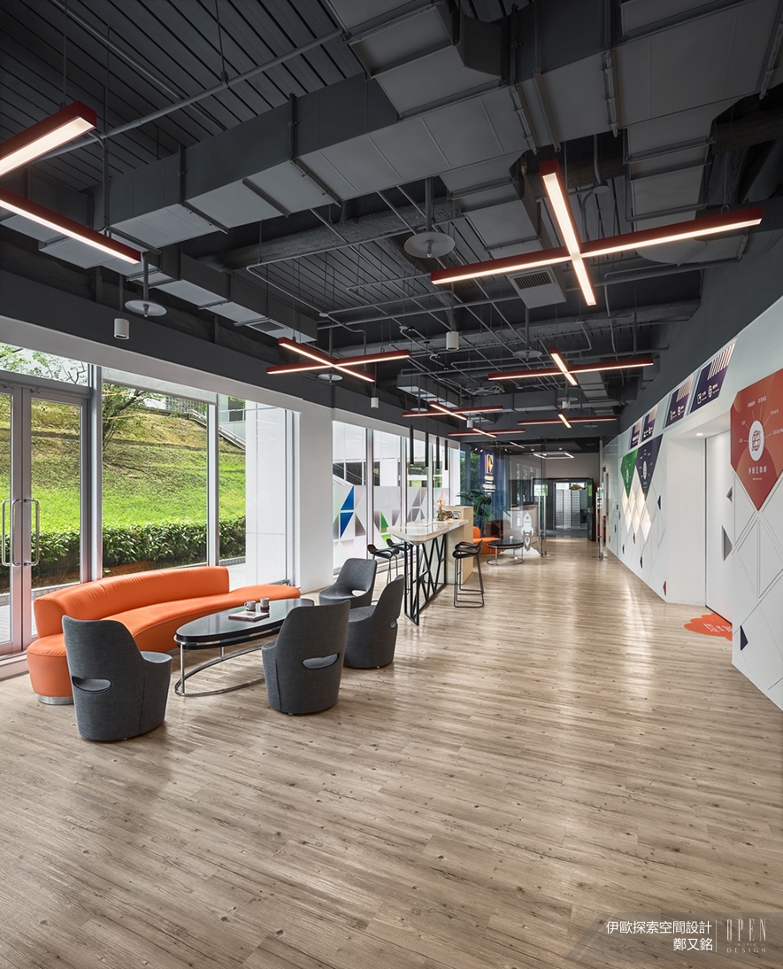 辦公室前端的會客間裡,明亮的採光與窗外的綠茵綿綿,緩和工業風天花板外露管線帶來的壓抑感;十字型燈管的造型設計,也提升空間的時尚色彩;木質元素地板的運用讓員工感受回到家般的舒適;四種不同的會客場域為來客打造多樣化的體驗,而家俱的擺放增加與客戶的互動性,椅件多樣的色彩變化講述不同議會討論方式,不論是中島吧台還是長型沙發都能任君挑選。