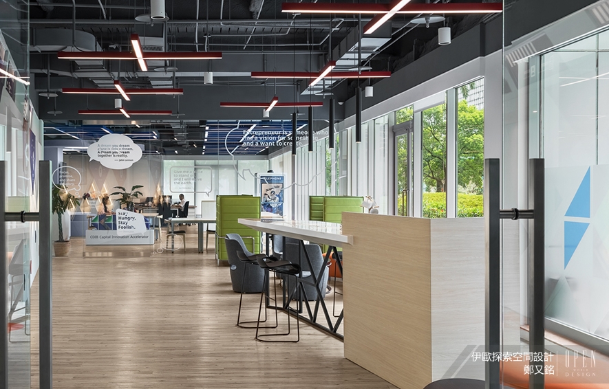現代時尚的燈管以不同造型分開會客與辦公區域,具有穿透性的玻璃門減少視野阻隔感,並貼上標語貼紙為室內注入輕鬆有趣的氣息;一旁電話亭造型的隱私區域貼心的在其中設立座位,讓私人通話不用再低聲細語。內部辦公空間劃分成討論區與個人座位區,開放式的空間讓員工能隨時討論分享以提升工作效率,也打破以往主管與員工的距離感為團隊加入活力能量。