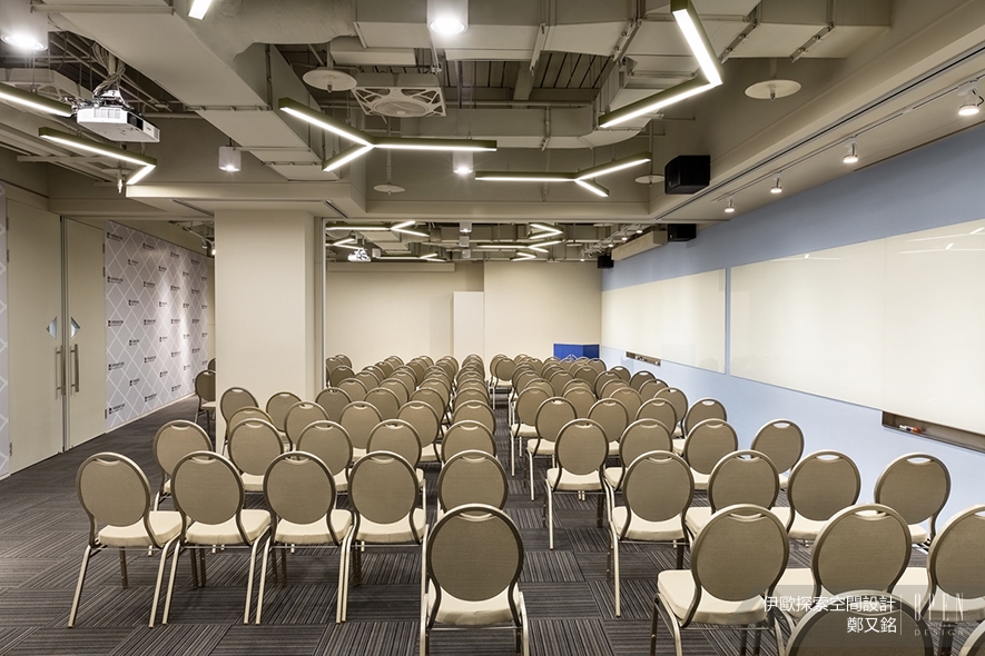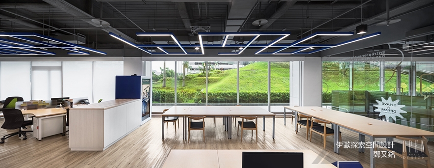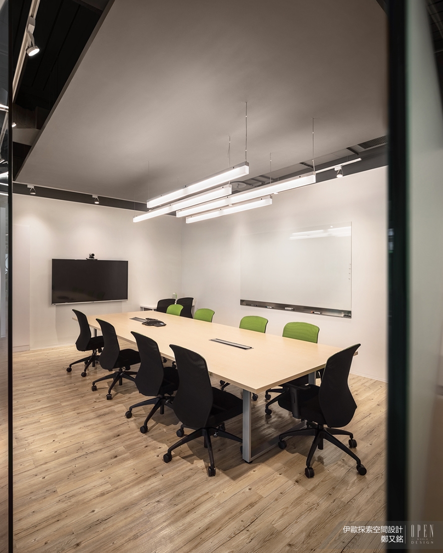 大型演講室裸露天花板展現工業風的大器風範,而白色系管線也成為室內妝點的一部分,側面以粉藍塗裝牆壁,清新的色系舒緩長時間演講的疲倦感提高員工集中力。小型會議廳以極簡主張剔除所有不安定因子,讓人心神專注於會議中,而木紋地板與綠色座椅的搭配,溫潤了空間的壓迫感;上方簡單垂吊的長型燈管錯落排列,除了提升照明區域外,也在高度簡約中找到設計感。伊歐探索空間設計 鄭又銘 設計總監 透過精細的材質挑選,言簡意賅表現俐落不失質感的時尚風格,豐富的色彩語彙構建自然氛圍,大面積自然採光將窗外美景帶進室內,舒緩辦公室所帶來的緊繃感受,為忙碌的上班族打造舒適放鬆的工作環境。