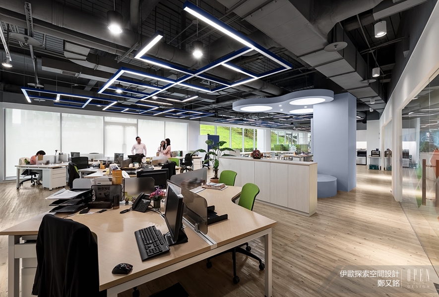辦公室空間設計,最大的理念就是要為同事們創造一個舒適、方便的工作環境,但既定的辦公室印象皆是狹小且缺乏光線的地方,不但使得工作效率低落,還危害員工的身心健康。伊歐探索空間設計 鄭又銘 設計總監 跳脫傳統的思想束縛,加上富有巧思的變化,將長條形的場域,以中軸線傾斜角度切分為一半,漸漸像漏斗型擴散,將空間機能做最大化的利用;把所有辦公區轉向大片窗外綠景的構思,不但舒緩緊張工作氣氛,還大大提振員工精神。