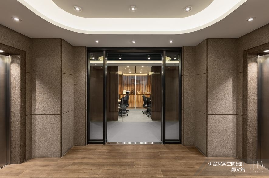 踏入梯廳,視線迅速被大量木色佔據,腳下的木紋地板及眼前的木質隔板,在相同色系的搭配下,讓人彷彿被大自然所包圍;梯廳天花板的設計,呼應會議室的弧形造形,讓人深刻感受到設計師所要傳達的意念。