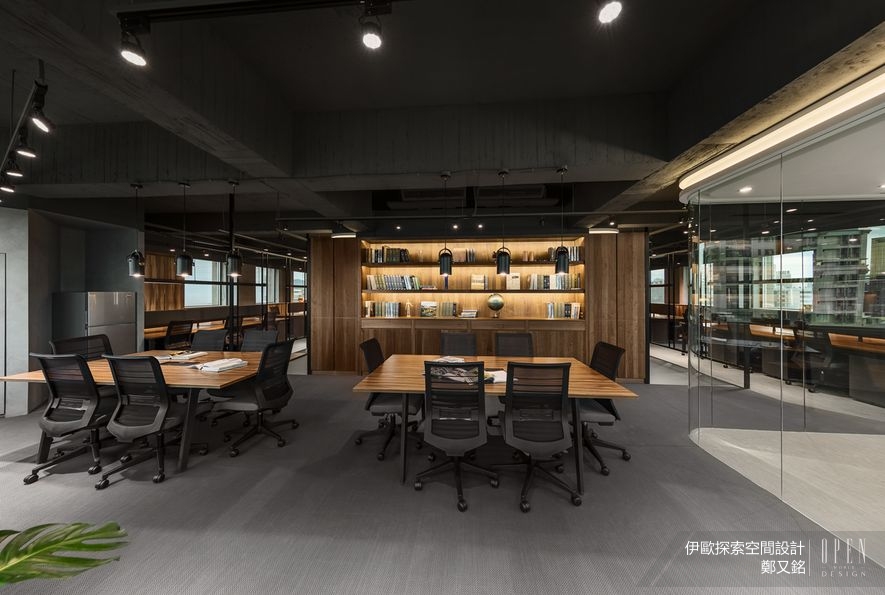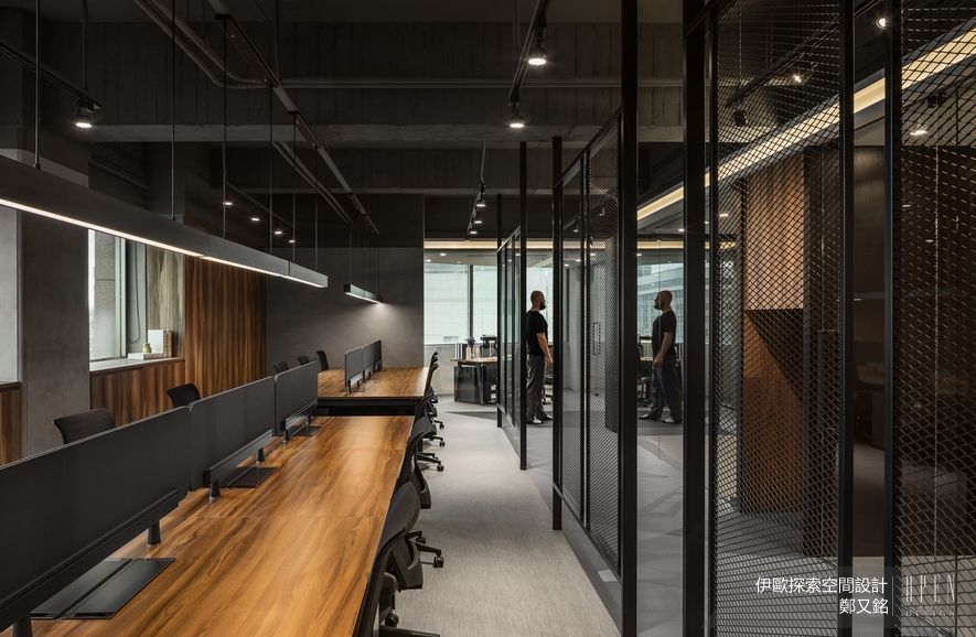 裸露的樑柱佐以黑色鐵件格網,將辦公區定調為LOFT工業風,並減少隔間使用,以材質最原始的樣貌,打造出個性空間。桌面部分採連貫長型木桌,建立出流暢的溝通方式,進而提昇工作效率;雖然是開放性空間,但桌面的黑色隔板仍可切分出個人領域,讓辦公時依舊能保有一絲隱蔽性。