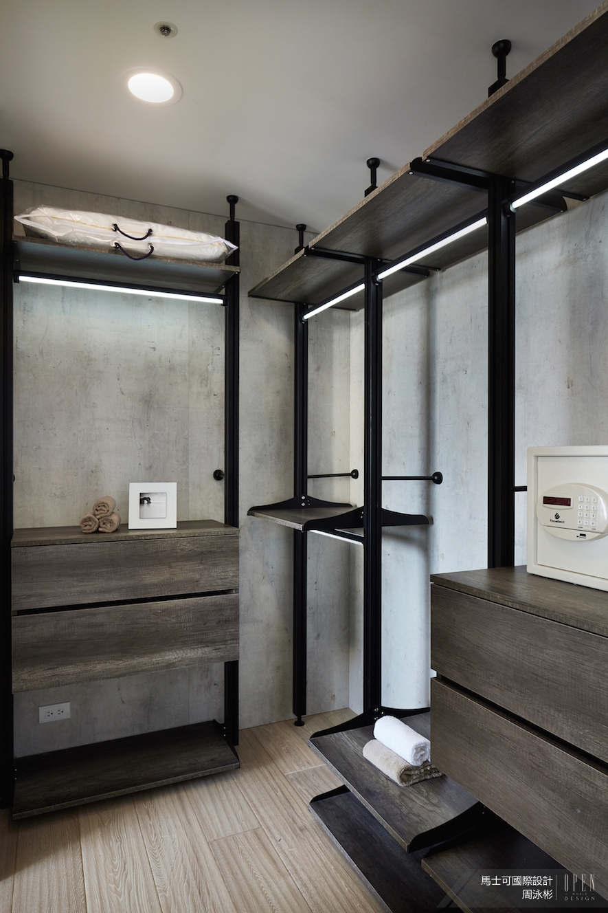 順著溫暖質地的手刮木地板進入更衣儲物間,宛若踏進時光隧道;黑色鐵件、深色木料櫃體,搭載不做處理的斑駁水泥壁面;重現老舊情懷,吐露歲月悠悠的韻致。透過復古木紋地板的相互纏繞,自然地將臥室的現代素雅,與更衣間的舊時氣息濃縮在同一個場景。
