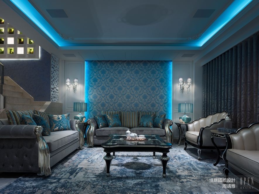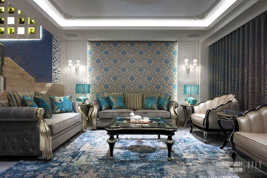 客廳中拉扣造型沙發與吸睛的貝殼造型單椅,共構細膩的宮廷風情;兩盞對稱的造型壁燈,串上華美的施華洛世奇水晶,流露奢華意韻。藍白相織的地毯與沙發背牆的藍成為空間主色,通過渲染手法與圖騰的齊整形象,堆疊顏色層次,創造多元的廳室面貌。由於屋主有影音視聽的需求,因此電視主牆選用晶瑩的玉石,保持主視覺的乾淨。作為迎賓場域的客廳,搭載智能情境配備,單手搖控便能整合燈光、帷幕及螢幕升降;輕鬆配合家人生活習慣,塑造溫馨且方便的觀影環境。