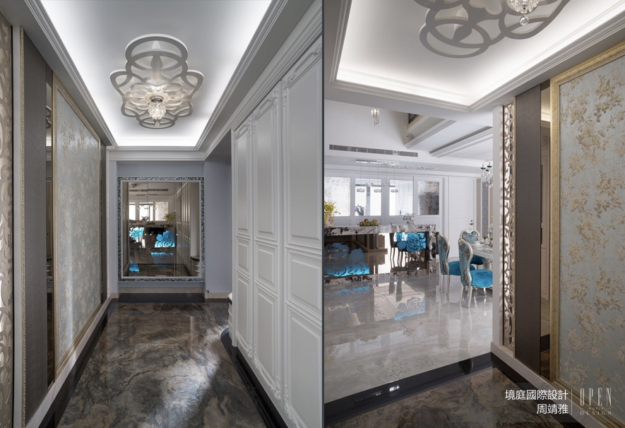 甫踏入玄關,眼前大片而典麗的花草圖騰隔屏映入眼簾,秀麗而典雅的形象通過金黃飾框與左右對稱的茶鏡,拉抬至更精緻的宮廷印象,替空間奠下華麗氣派的基調。大門右方的寬幅穿衣鏡具放大空間效果,更隱藏收納機能於其中,在櫃門開闔間傾刻化收納於無形。而貝殼板的低調光澤作為鏡櫃收邊,進而使單薄的鏡體增添一縷優雅氣息。頭頂上的訂製雕花板及櫃體線板漾著古典語彙,訴說著家庭成員對歐洲的浪漫嚮往;沿著如歐洲地圖般的特殊大理石,一條「絲綢之路」於足下盛大展開,將我們帶向一篇篇譜寫不斷的流金歲月,與那些關於家庭的美好篇章。
