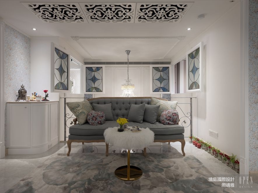經由餐廳後方階梯步上二樓,純白畫面中以復古的灰色拉扣沙發及低明度的灰底花卉地毯,襯出場域沉穩的優雅氣息,另以些微的金器與雕花勾勒貴族風尚。透過門口對稱的景觀櫃,臥室主人能夠擺放喜歡的物件,塑造不同的臥室想像之餘,也替空間增添別緻可愛的一面。藉由設計師合理拿捏奢華與經典的比例,小巧的起居室也能給人浪漫唯美的印象。