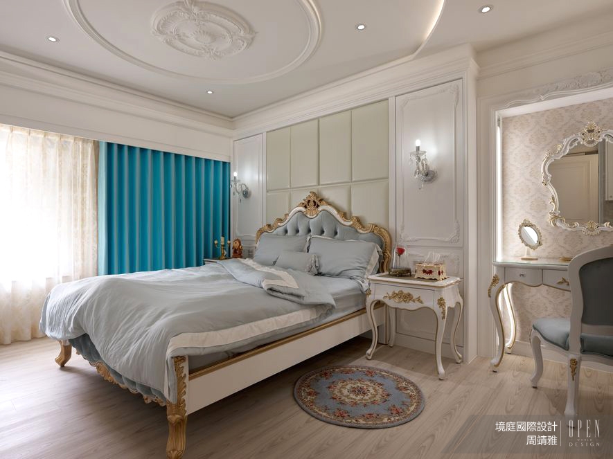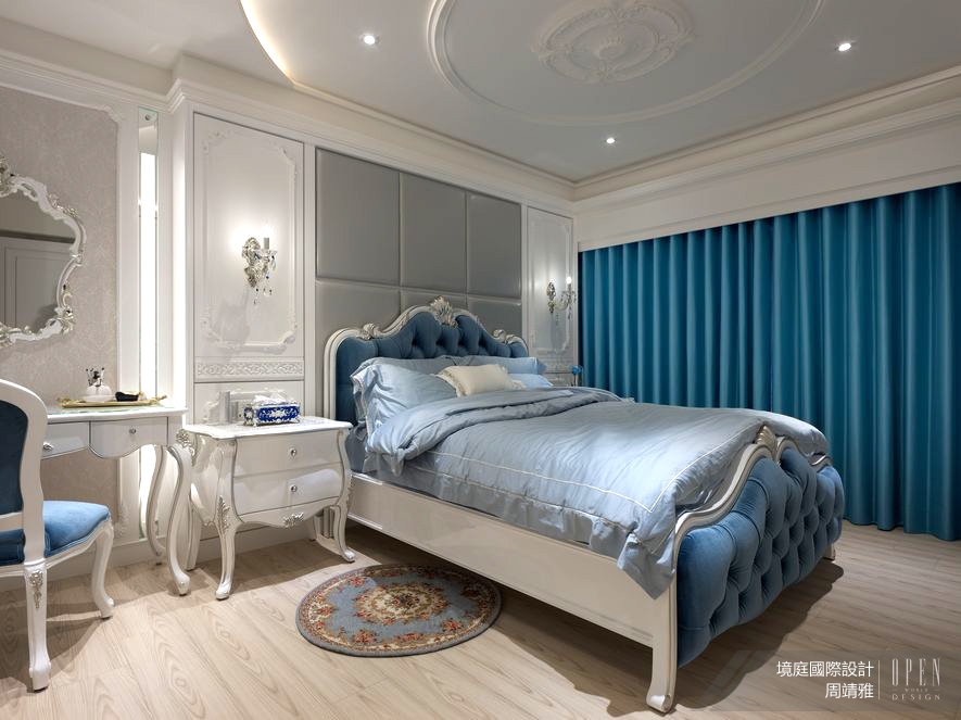 主臥與女孩們的臥室以華麗宮廷作為主軸,在造型一致的床頭主牆與臥床中,分別以房間主人的喜好配色;成熟而內斂的紫藕色、清新而躍動的果綠色、高雅而文靜的湖水藍,輔以滾金邊或描銀線的手法,營造各室獨特的魅力氛圍。而三個房間的線板設計與邊櫃造型亦揭示女主人們對新古典風格的喜愛,我們在靈動的流線與水晶壁燈中,看見更多的是對經典美學的盛讚。