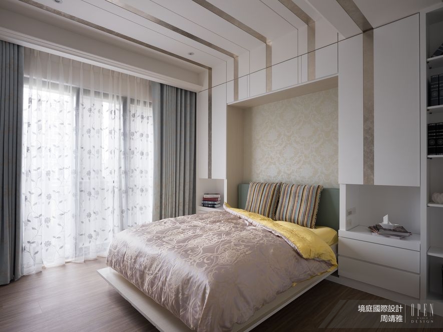 男孩房隔去浪漫語彙,僅以淡金線條穿過簡明的空間,勾勒典雅基調。空間中以機能作為核心,藉著可立體收納的床板,創造更自由的使用方式;半開放式的置物櫃,亦打造俐落的場域感受。當陽光灑落溫潤的木地板,乾淨整齊的臥室中,緩緩道出一種大方而真實的主人面龐。