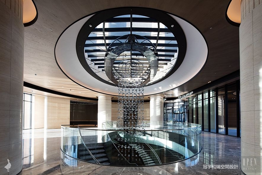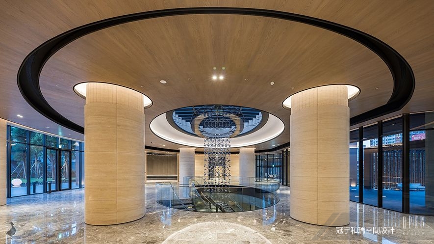 進入公設內部,挑高的大廳盡現尊榮與大器,特殊設計的造型穹頂,利用同心圓內部嵌入六個橢圓,高低差距營造不斷延伸的視覺效果,以清新透亮的姿態將光挹注於整個內部角落,矗立四方的洞石圓柱連接上方橢圓天井與米白壁面,延伸整體空間的連續性,在縱與橫之間劃出不同的機能動線,成為融合與轉換的中心點。
