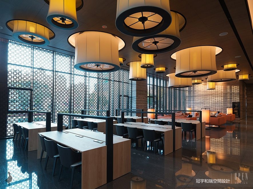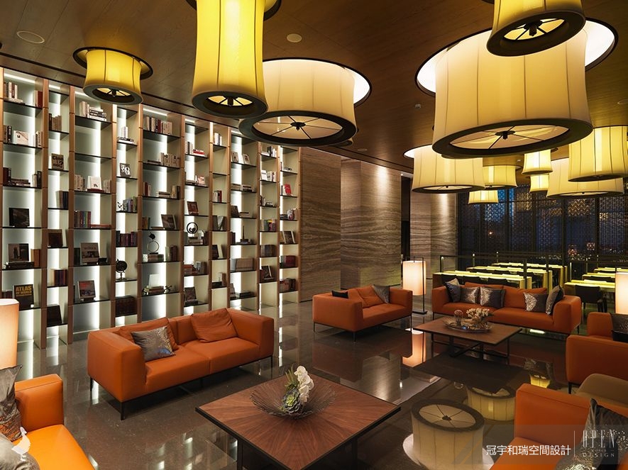 圖書室入口意象造景,以文字記錄方式為發想,以竹簡進而轉變為古書,而至現代彩色印刷的書籍;從古到今、由暗轉明成為知識傳承的起點。延續洞石細膩雅緻的觸感,鋪墊出溫和放鬆的氣息,空間被妥善的分成兩端,悠閒愜意的沙發區與仿造自習室的閱讀桌,提供多面向的選擇。五米高的書牆、五百本藏書,使空間流露濃厚的人文氣息;利用雷射切割的大片窗花,局部遮擋日照西曬的刺眼光芒亦能使窗外美景隱約地映入,在遮掩與穿透之間取得完美平衡;以蠟燭為發想的柱燈,大小錯落不但解決了消防難題,也為天花板添上不少活潑氣息,讓書客不自主地莞爾一笑。