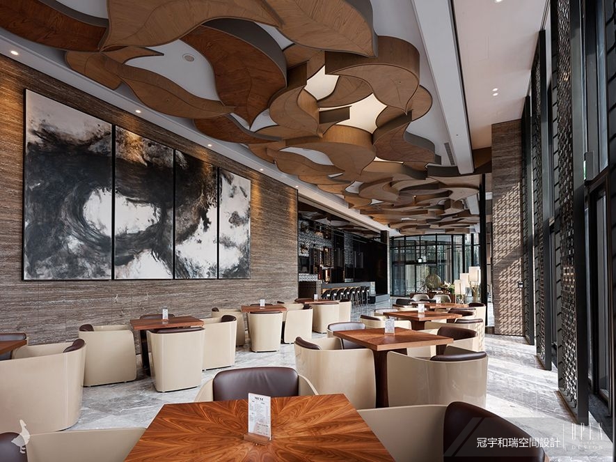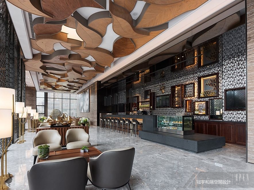 位於東面的咖啡廳提供住戶悠閒的用餐時光,前後端的不同設計,應對一天中不同機能的使用:早晨作為早餐廳;下午時喝杯咖啡;也可以是晚上雅痞聚會的LOUNGE BAR。以黑色鍍鈦圍塑出的吧檯空間,金屬磚的壁面處理搭配著玫瑰金色調的紅酒架,展示現代優雅質感;以仿生概念轉化葉型天花板,一片片錯落的樹葉透映灑落的陽光,延續鄰近南坎溪邊的美景,沐浴於靜謐森林的懷抱中。