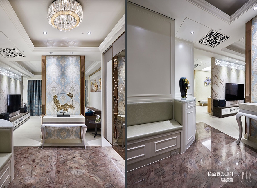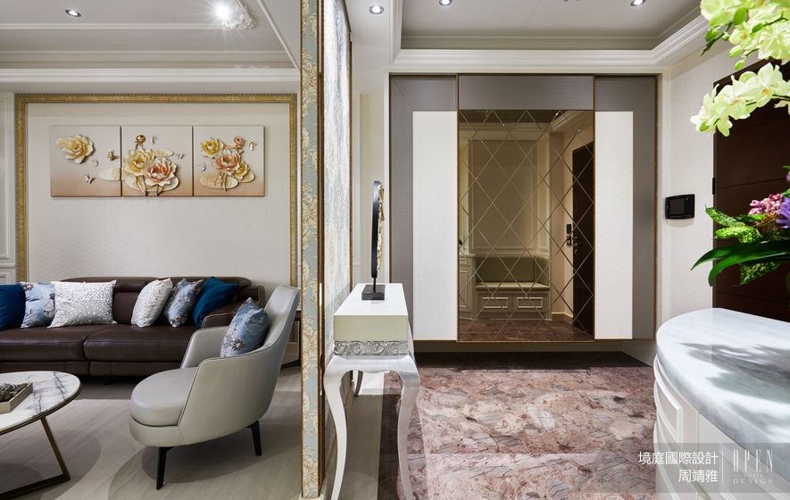 甫進玄關,紋路豐富的大理石地板在光線的導引下,色澤於貴氣的藕紫與嬌嫩粉色中隨意遊走,與室內淺色地坪拉出內外分野,同時營造鋪設紅毯迎接貴客的意象。右方鞋櫃的茶色菱鏡與屏風的鍍鈦飾板加深了場域的奢華印象,淺灰皮革與淡藍圖騰則輕巧的替空間披上優雅外衣;多材質的靈巧運用提升了整體視覺的豐厚度,亦產生一種平衡互補的趣味。