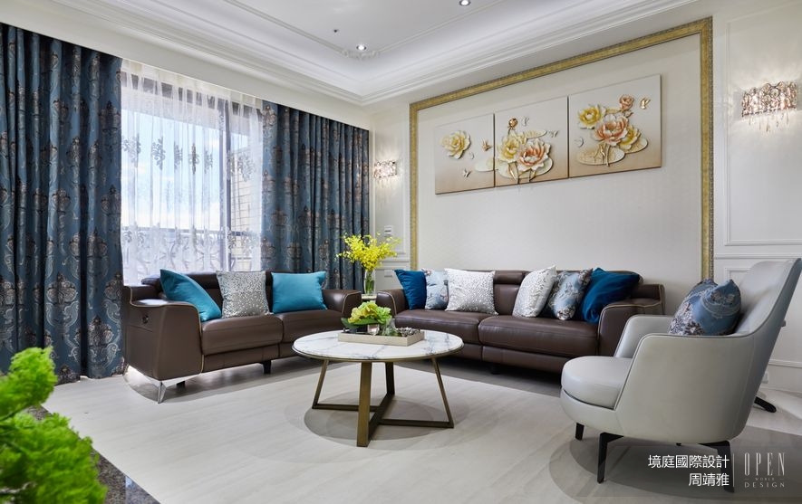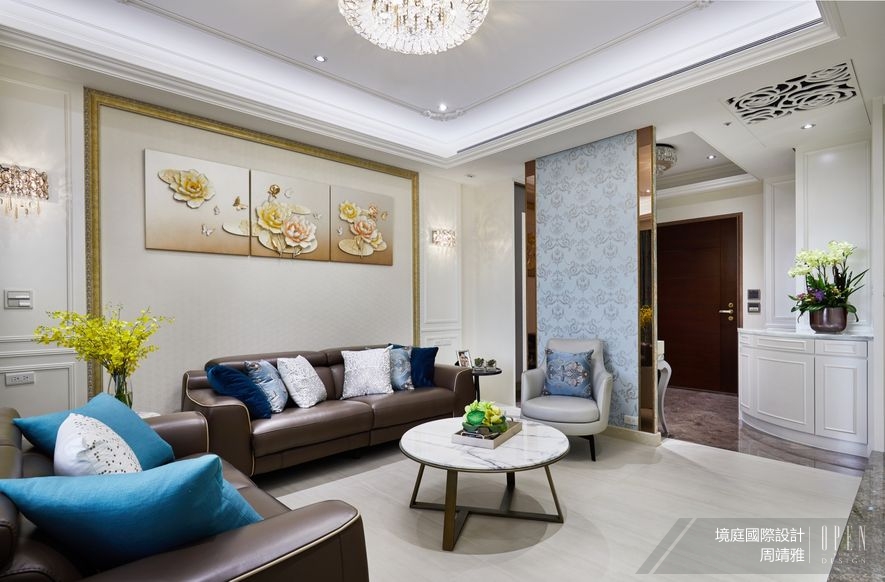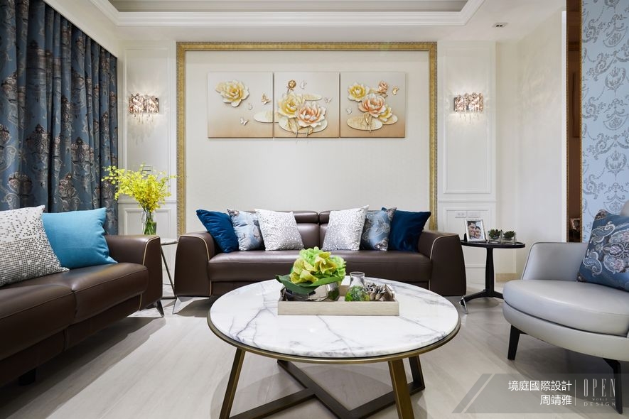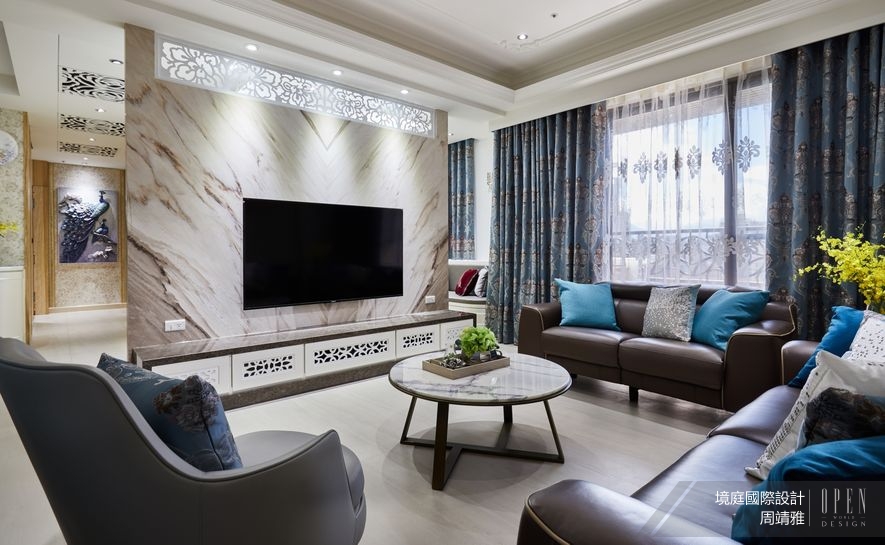 穿過屏風,深棕皮革沙發與微帶紋彩的淺色大理石牆,為廳堂拉開簡單卻不單調的場域印象;純白的電視櫃平衡了石材的視覺重量,牆面上下鑿空的雕花則將空間中的輕薄感與穿透感向上拉抬一個層次。沙發背牆中金色貝殼石與金屬飾條構出矩形樣式,不僅和電視牆相呼應,亦與兩端的水晶燈盞共同呈現奢華情致。空間中大量運用清爽的藍色調亦是一大亮點,明暗濃淡各有意趣的青藍抱枕、礦藍窗簾等物件,於光線灑墜後巧妙佈出客廳的輕盈姿態。