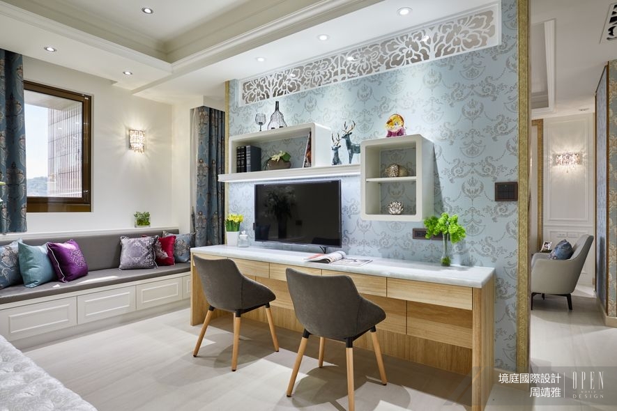 電視牆同時作為書房隔屏,大大提升了空間的可利用性,為場域隔出獨立性亦在動線中帶來更富新意的更迭感。有別於前端客廳的對比質韻,書房的淺色調性則在淺藍壁紙、白色系檯面與清淡木作體中一覽無遺。當讀書辦公感到疲累時,移步向左便有一處簡單臥榻,方便休憩、覽看窗外景致;此處便能看見設計師是如何以無聲的溫柔,輕輕地緩解我們緊繃乾涸的思緒。