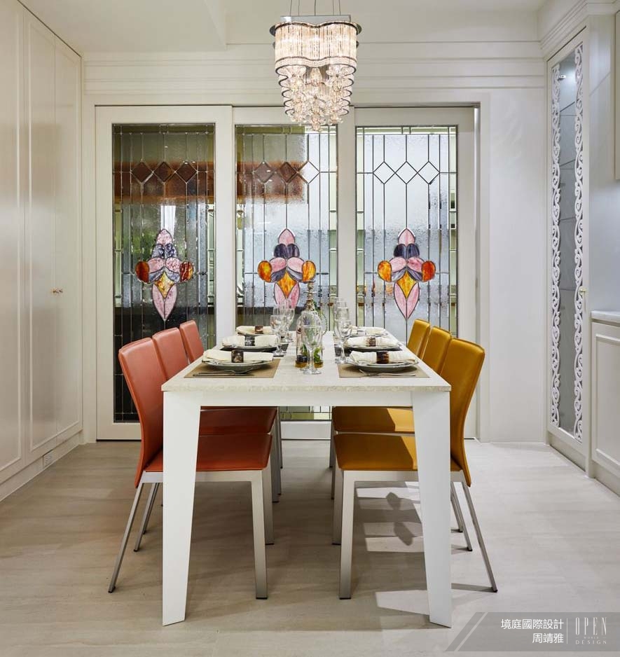 信步來到餐廳,截然不同的暢然感受再次登上心頭;銘黃,梵谷名作「向日葵」中的主色,一種充滿生命能量的愉悅色彩;撞上既熱情而活潑的暖橘,形塑了餐食空間的活力,亦刺激誘發出人們的食慾,使得在此用餐成為一件快樂而備受期待的活動。向內,一座簡短的輕吧檯成為餐廳與熱炒區的過渡連結;熱鬧的橘紅自餐椅、吊櫃至廚房收納逐漸沒入收攏,使整體氛圍做了緩和漸進的收束。一道可完全收合的霧玻門扇,為餐廚區增添空間的彈性機能;闔上時可隔絕油煙,門上的彩繪更在隱約光線中構成一幅秀美端景。