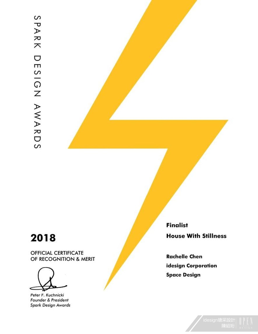 Spark Design Awards(星火國際設計獎)為美國深具專業權威,並行之有年的國際性賽事。不僅注重作品的外在形式,更著重於設計本身的理念,希望能夠從純粹探討設計的角度,審視參賽作品的前瞻性、獨創性、啟發性等超前創意精神,同時以美觀性、耐久性及安全性等項目作為遴選標準。此次idesign塘采設計 陳紹珩 設計總監 以作品《沉穩之間》中的溫婉內斂,展現深厚的空間陳述功底及視覺調控手法,獲得評審們一致青睞,為其頒發獲獎證書,以期許她能持續創造更多作品,為國際間的文化交流帶來更熾熱的花火!