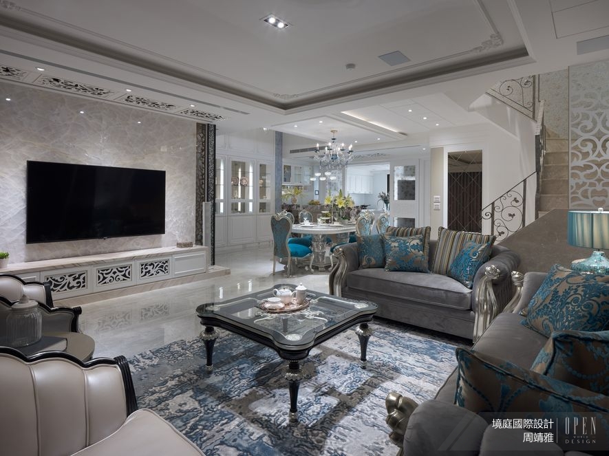 客廳中拉扣造型沙發與吸睛的貝殼造型單椅,共構細膩的宮廷風情;兩盞對稱的造型壁燈,串上華美的施華洛世奇水晶,流露奢華意韻。藍白相織的地毯與沙發背牆的藍成為空間主色,通過渲染手法與圖騰的齊整形象,堆疊顏色層次,創造多元的廳室面貌。設計師為滿足屋主影音視聽的習慣,因此細心搭載智能情境配備,例如單手搖控便能整合燈光、帷幕及螢幕升降地機能設計,塑造溫馨且方便的觀影環境。