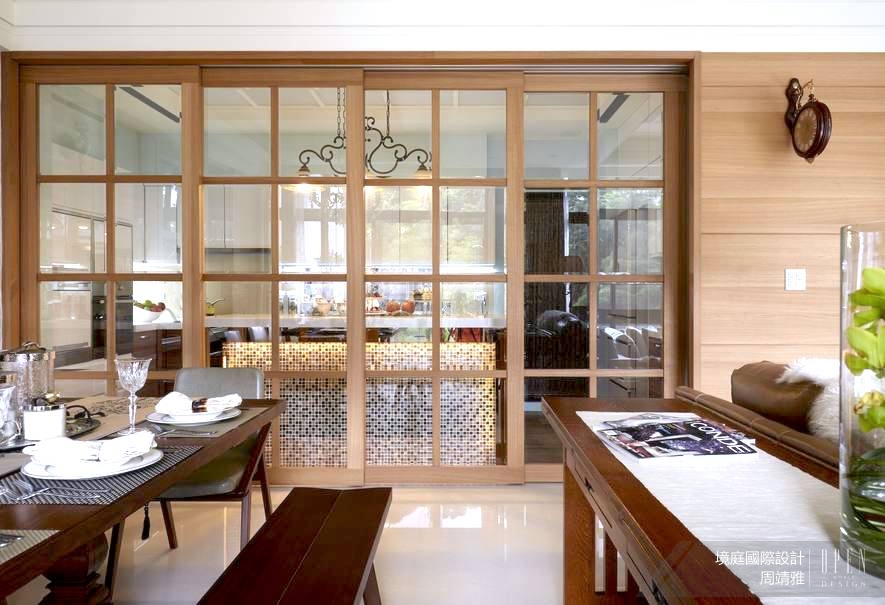 餐廳天花板特別以溫暖的木色裝設,劃分出與客廳相異的場域性質;並與牆面木質相呼應,挹注溫暖人文氛圍;當晨曦自落地窗灑落,居住者得以清新開朗的心情,邁向嶄新的一天。廚房與客餐廳之間運用玻璃拉門作為空間區隔,免於烹飪時的油煙瀰漫至室內,同時保留視覺上的通透性,讓家人之間的情感流通無礙。