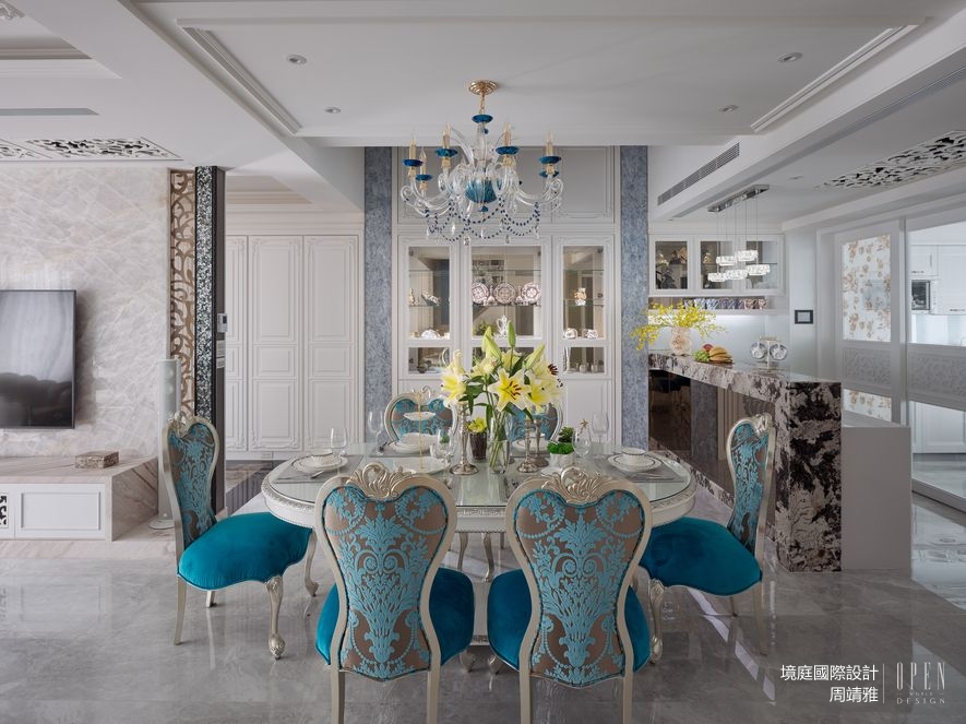 餐廳擔起銜接烹調區與客廳的重責大任,桌面橢圓造型平衡屋內的稜角線條,亦是設計師於頻繁行經的動線中,為確保行走安全的細心體現。而精心設計的圖騰絨面座椅,與上方水晶吊燈分別以孔雀藍作為主體及點綴顏色,達到協調空間色彩氛圍的功能;靜謐的藍更給予環境寧靜想像,使進餐成為一幅優雅的生活場景。廚房則以半開放的玻璃拉門適時隔絕油煙與氣味,透過門上的流線紋飾和古典玫瑰窗貼,完整營造屋主夢想中的歐式風情。