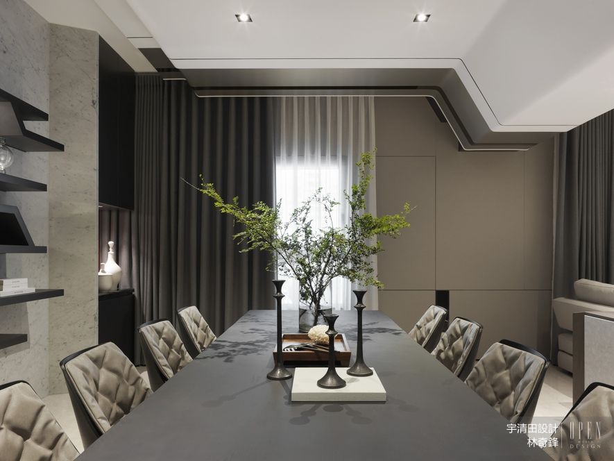善於透過簡單語彙勾勒強烈想像的宇清田設計團隊,於本案中大膽揮灑色彩,在低明度色域裡渲染酒紅色的濃郁與內斂,暈散出大氣低奢的居家想像。而穿插其間的另一個空間題材——線條,則指出場域中理性規整的風格,既作為壁龕邊飾將艷紅收納,亦劃過天穹軟化橫樑的突兀視感,使「簡約摩登」與「古典對稱」相融為過目難忘的鮮明家居。