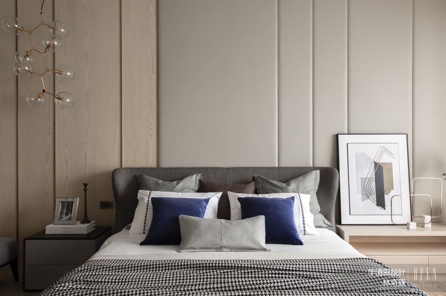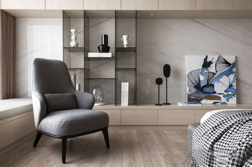 地坪在進入主臥房後由斜轉直,悄然連接床頭的異材質壁板,構成睡眠場所的和諧對話。立面則以巨幅石材描入淡彩,鑲嵌開放式壁櫃顯現幾何的精簡之美;並選用濃黑色彩綴飾空間體裁,為屋主的思眠心緒鋪床;當夜色入戶,或坐窗榻或臥於床,任由煩惱化開於輕盈場域之中。