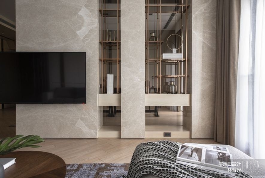 設計師在室內植入精緻的簡約柱體,於虛實相交中,圍塑出通透而穩固的家居形象;搭配金屬層架及藝品擺飾,拉升宅邸的富麗序幕;揭曉上下綿延的純樸木色,以此自然意蘊軟化石柱、鐵件的剛冷,指向通往私領域的途徑。公領域全區運用木作拼板鋪設,以同質天花帶區分疆界,餐區域立面則延續相同手法,保持公領域的大器語彙;邊柱則裝載茶鏡連延上升,化解因橫樑低矮造成的壓迫感,構成左右延展的開闊景色。