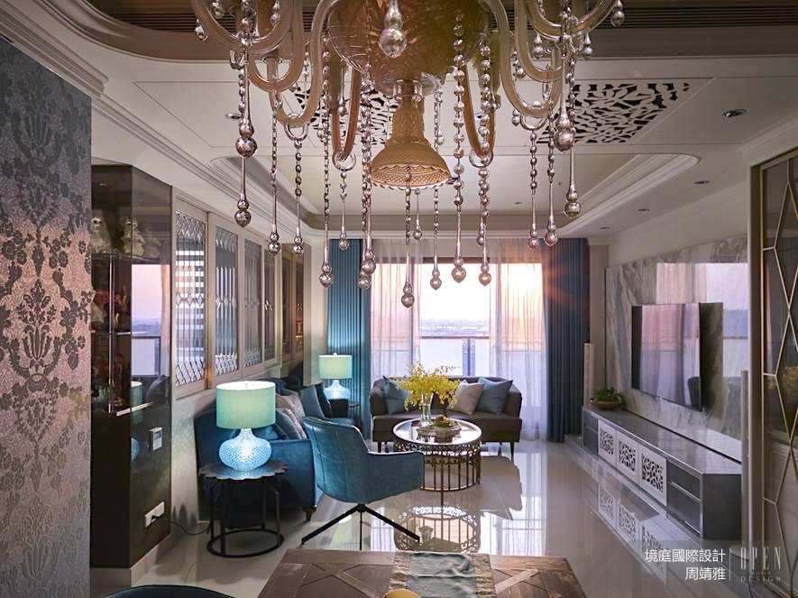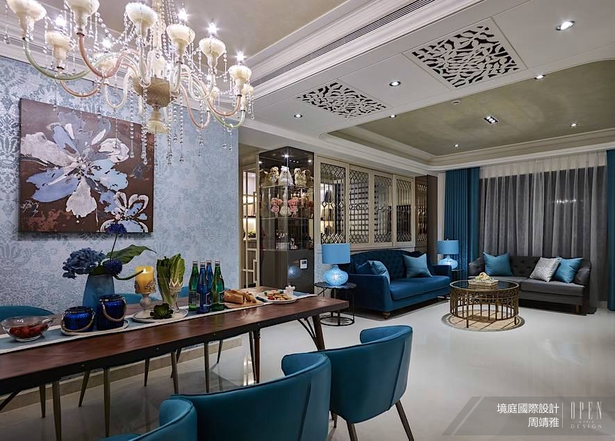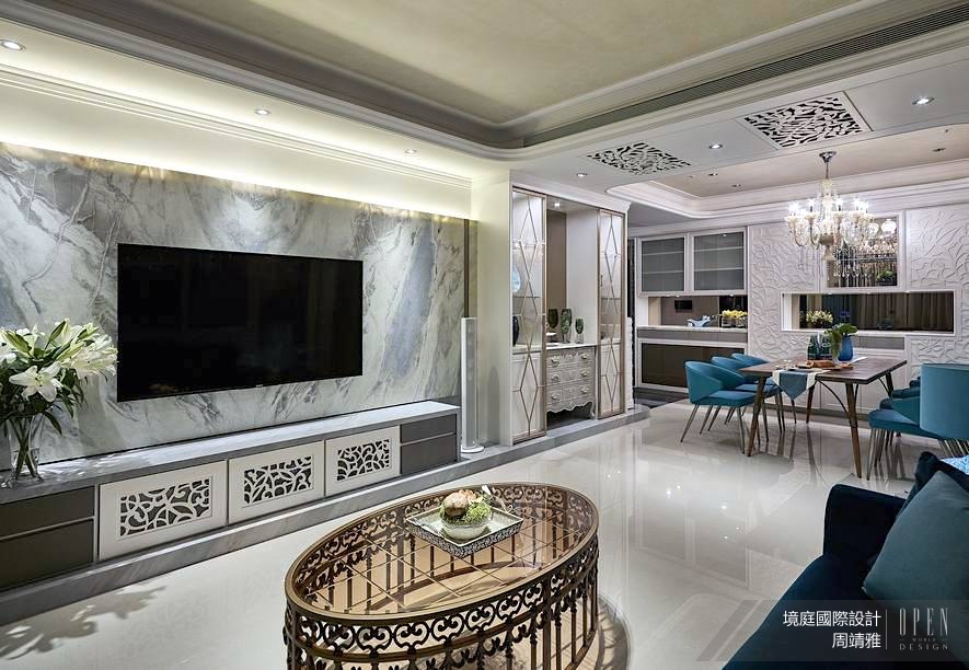 敞開家門宛如參與一場宮廷盛宴,細膩打造的優雅氛圍鋪述出場域質感,鮮明且獨特的色調揮灑絢麗的空間樣貌,極致刻劃家居的美學品味。作為歐洲古典宮廷中極具特色的元素——古希臘線板,貫穿整個公領域,從天花板至電視櫃都能見其身影;繁複曲折的線條設計,亦雕琢出歐式的唯美風情。