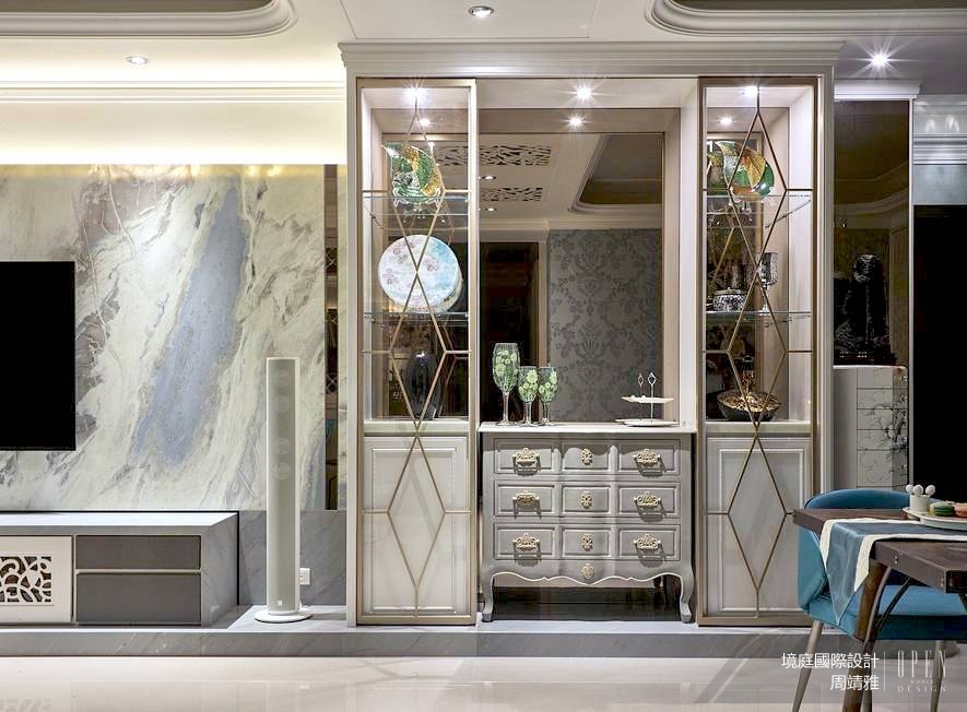 天花板上乍看為裝飾性質的雕花線板,竟是冷氣出風口的再設計,而此一元素同樣運用在櫃體、屏風上與之相呼應,也為整體空間的宮廷風格更添精緻典雅,令人不禁佩服設計師的匠心巧思。而「收納機能」一直以來都是境庭設計的強項,如何讓櫃體呈現不同樣貌,又兼具展示收藏之用,在本案中可說是展露無遺。
