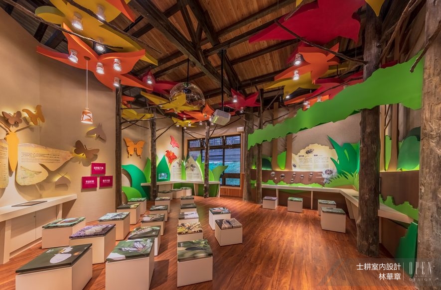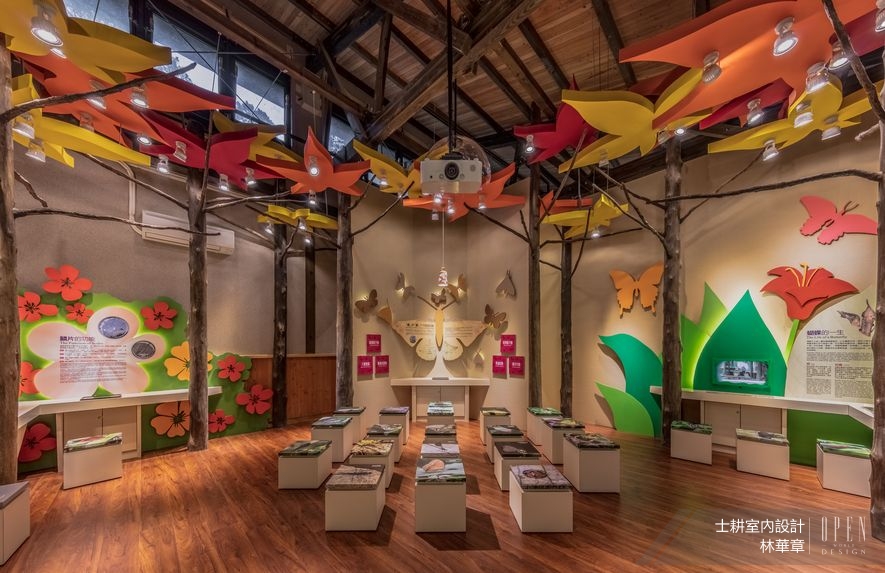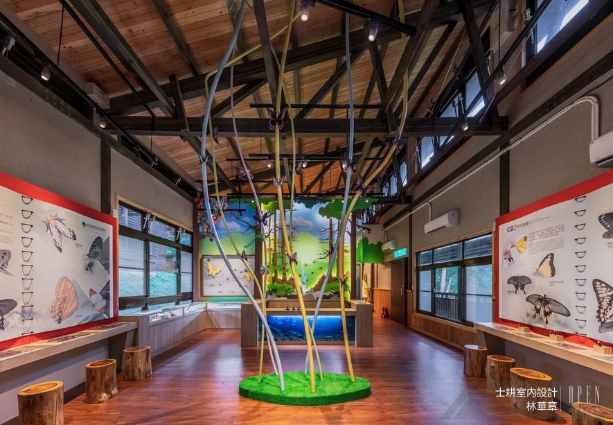 蝴蝶館開門即見蜿蜒上天的色彩線條裝置,以生活於此林地的蝶類為依據,沿線佈置擬真蝶型裝飾暗示其飛行路徑,除呼應生態特色外,亦成為後方洽詢櫃檯的緩衝屏風。踏上暖棕色的木質地坪,中央裝置隱然形成的環形動線,引導遊人逐步賞析兩側展板,或坐上樹塊單椅認識各生態場景。有了基礎了解後,腳步隨後移動至後方的「月圓大戲院」,以陣列展開的單椅上方,是各式各樣的蝴蝶攝像;使人觀賞介紹影片同時,彷彿乘著身下所捕捉的靈動蝶影,以另一種視角周遊林間。而延續入門區塊的動線構想,此處亦採用環形設計,周邊的花型壁飾結合互動教學設備及說明牌,依傍橘黃楓葉準確灑落的充足照明,盡情地讓思緒享受山林之美。