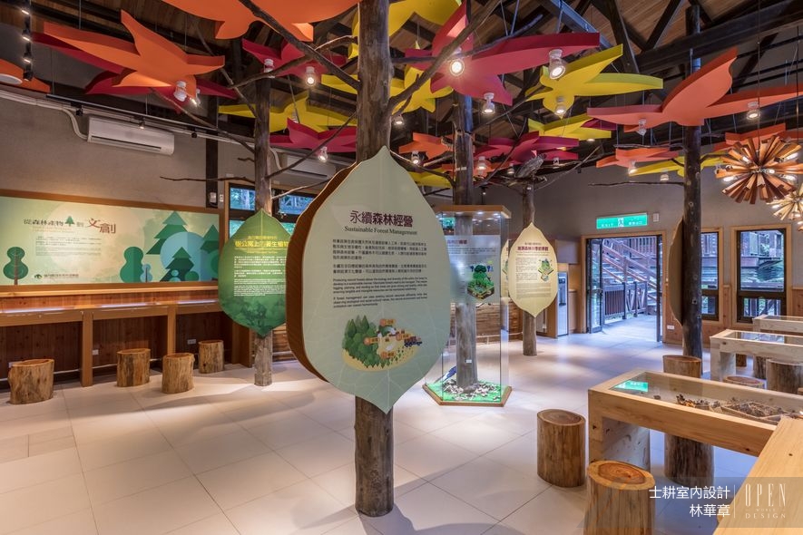 配合「森林館」的狹長走勢,設計團隊順而重現進入山林的視野,以直線構成行走路徑並形塑景深;沿途鋪排的柳杉樹幹亦扣合園區人工林的特色,將區域豐富的樹種與鳥類群聚至此,不僅以葉狀展板紀錄牠們的來歷,更透過當央的五角立櫃置入精細還原的標本,具體展示滿月圓叢林中常見的鳥類英姿。邊側的年輪座椅則採用林木切面為發想,與實木材質的展示長桌成套,引人入座遍覽現代林業衍生出的文創產品,搜羅滿月圓森林的古往今來。